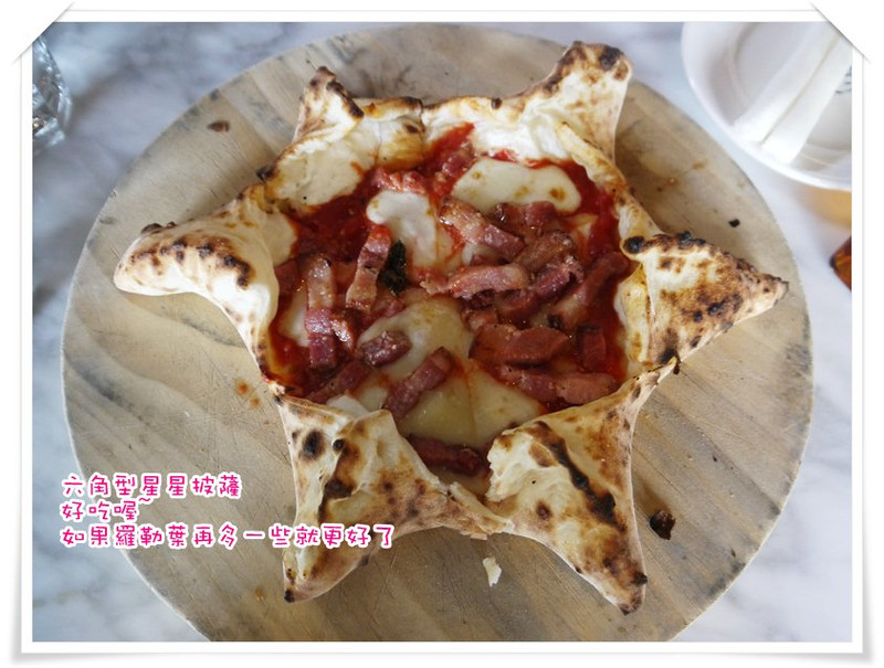 好在這批薩的餅皮滿有Q度,培根肉也不是原先想像那種薄片、很鹹的培根,而是厚切肉條,滋味也不錯,星星的角角內包起士,香濃順口,我喜歡。