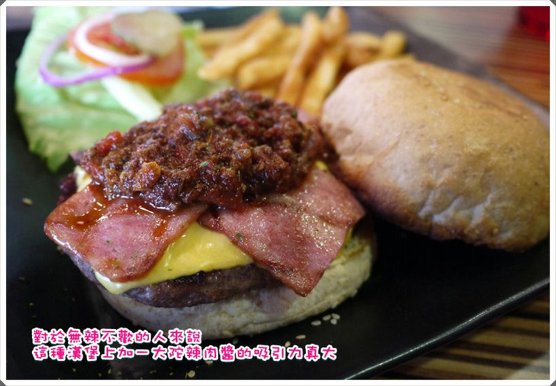 即使門口貼著商業午餐特價的漢堡我也依舊不心動,坐定後,馬上點了觀望許久的辣肉醬牛肉堡,有辣又有牛,這不是專門為我準備的是什麼???哈哈哈~